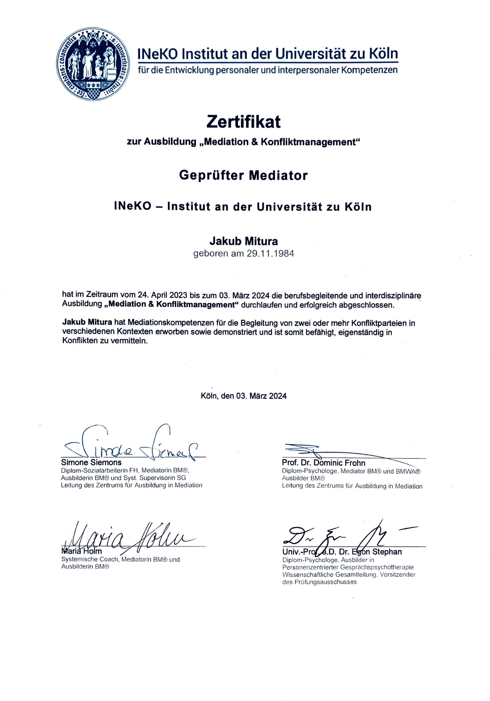 Geprüfter Mediator, INeKO Institut an der Universität zu Köln, 250 Stunden