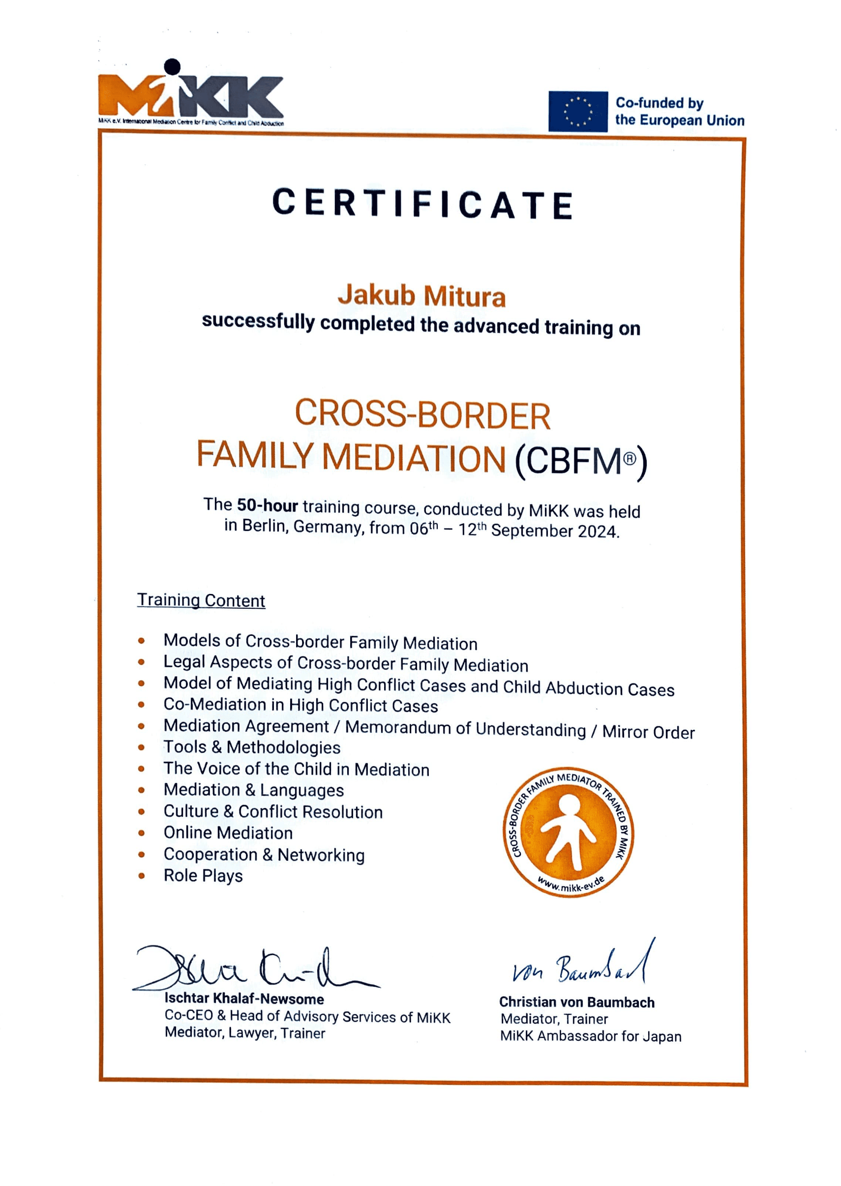 Fortbildung zum Mediator für internationale Kindschaftskonflikte, internationale Kindesentführung sowie Umgangsregelungen bi-nationaler Eltern durch den MIKK e. V. International Mediation Centre for Family Conflict and Child Abduction
